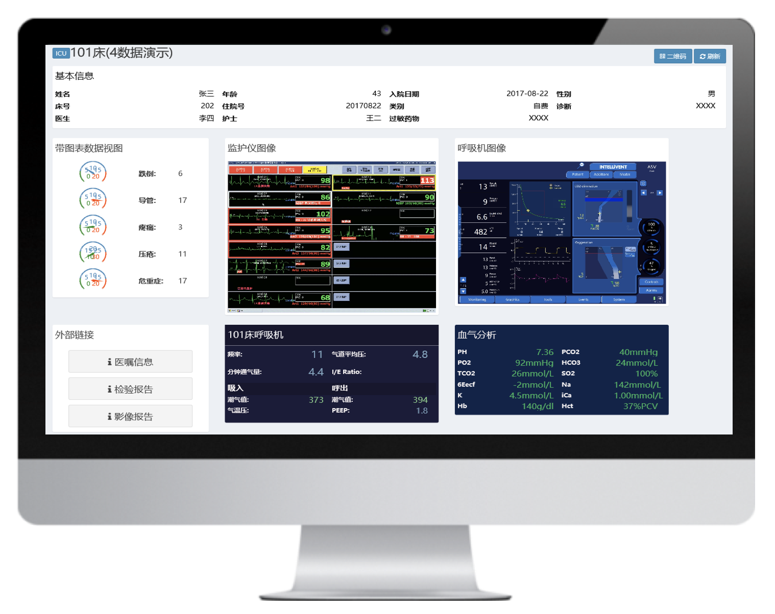 通過的最新的數據采集技術和網絡技術將多臺不同品牌的有創呼吸機聯網,并通過大屏實時集中呈現治療預設參數和監測參數,實現多臺集中監測、集中管理和數據存儲。